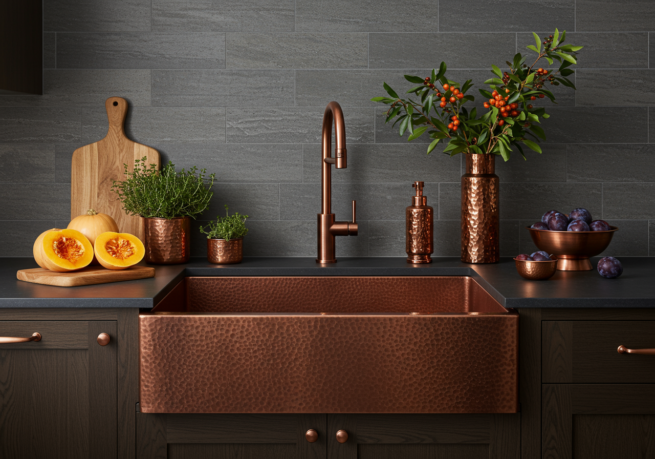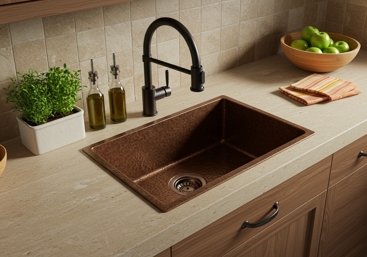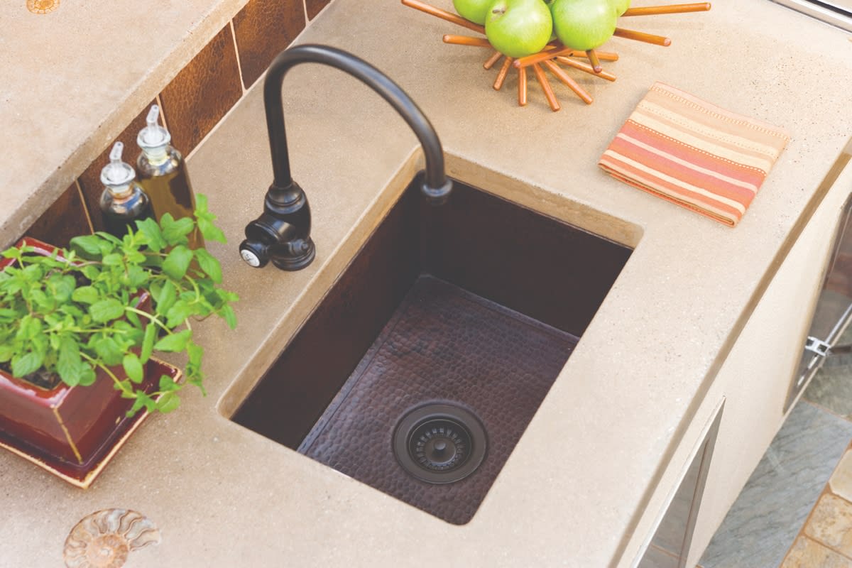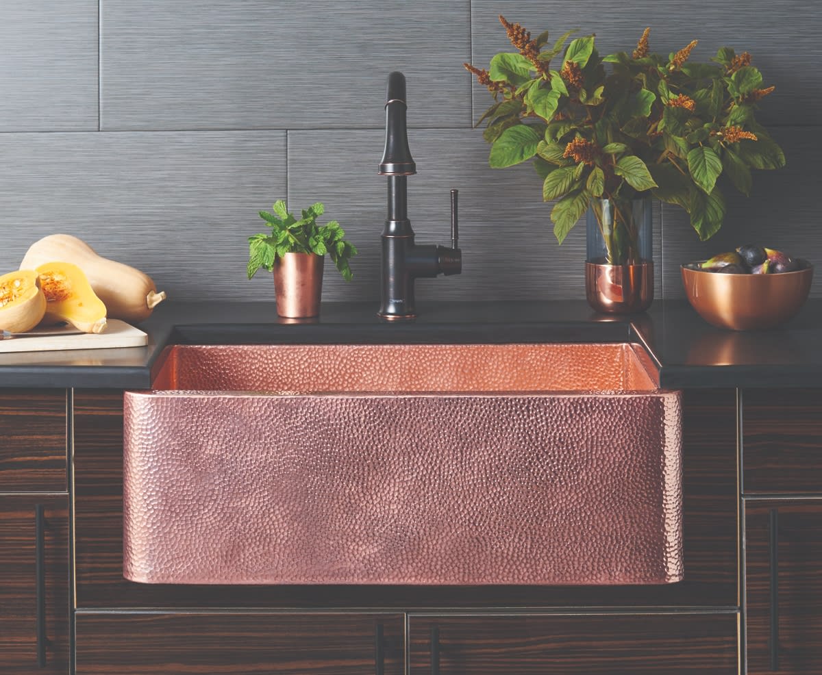 “Copper itself kills harmful bacteria, a true benefit in the kitchen and bath. Hand-hammered copper is also among the most durable sink materials available,” she adds.
